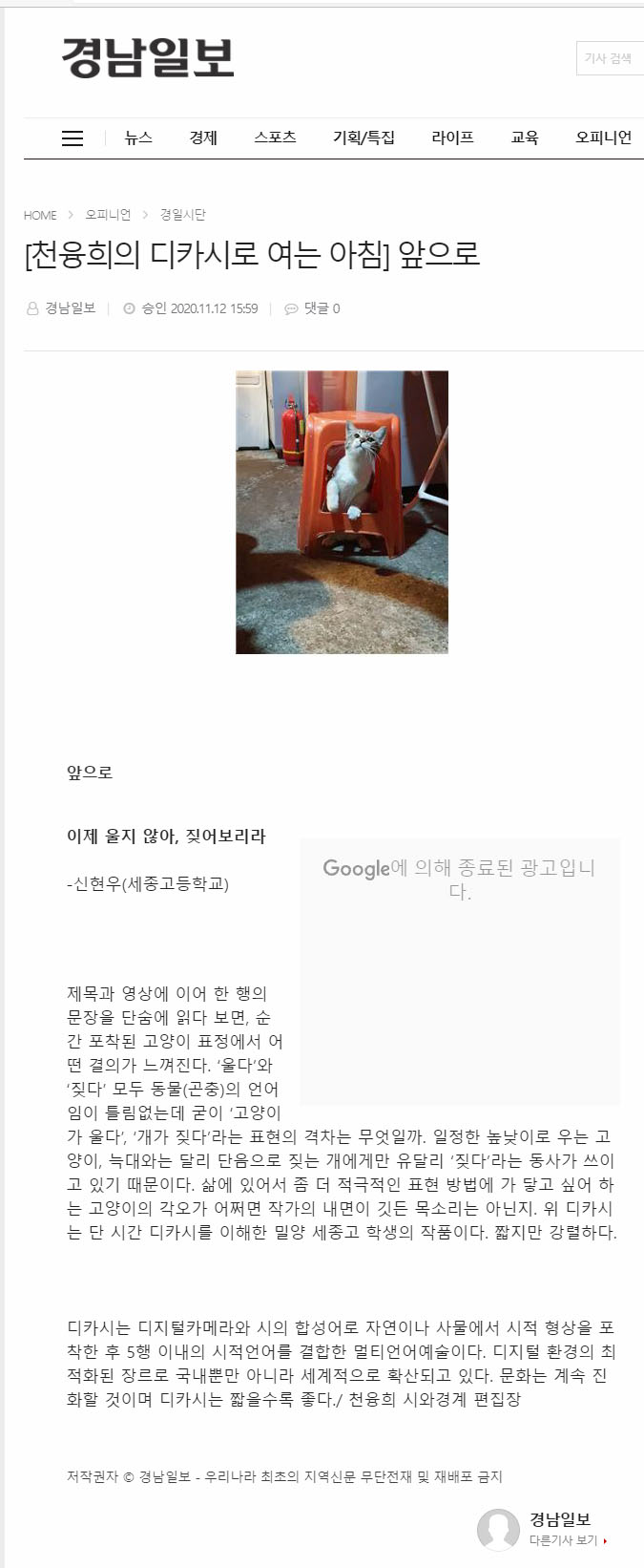 천융희의 디카시로 여는 아침 '세종고 신현우'