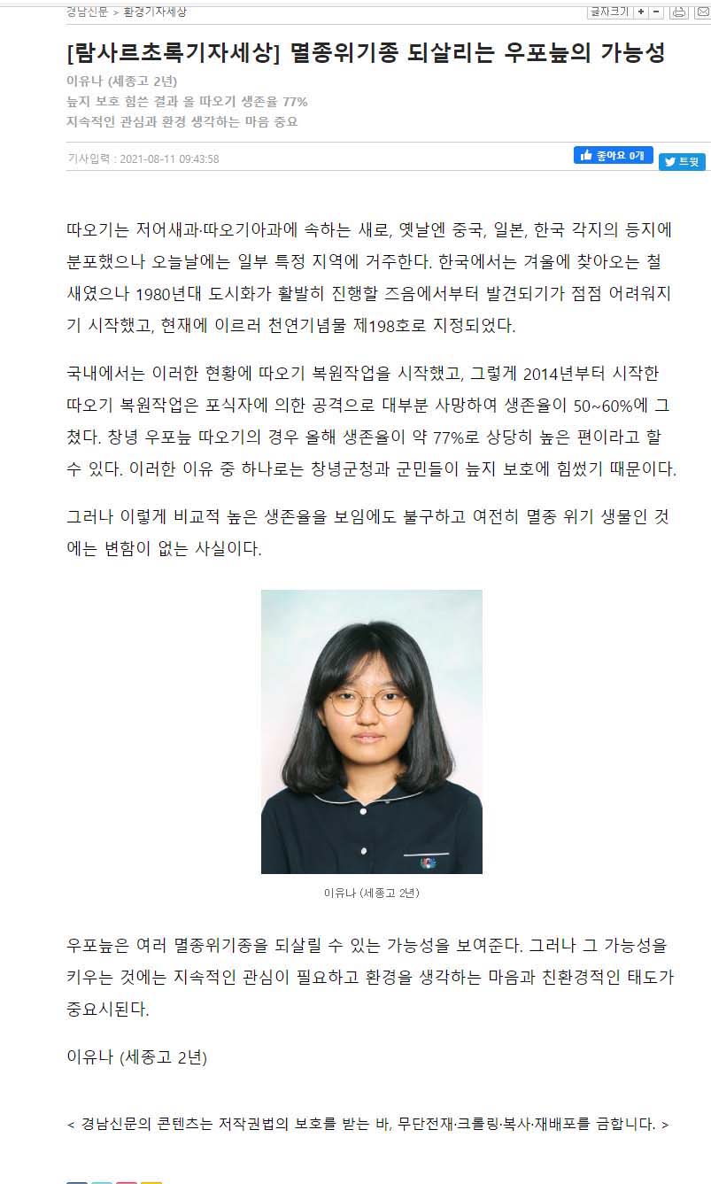 '람사르초록기자' 세종고 이유나(멸종위기종 되살리는 우포늪의 가능성)
