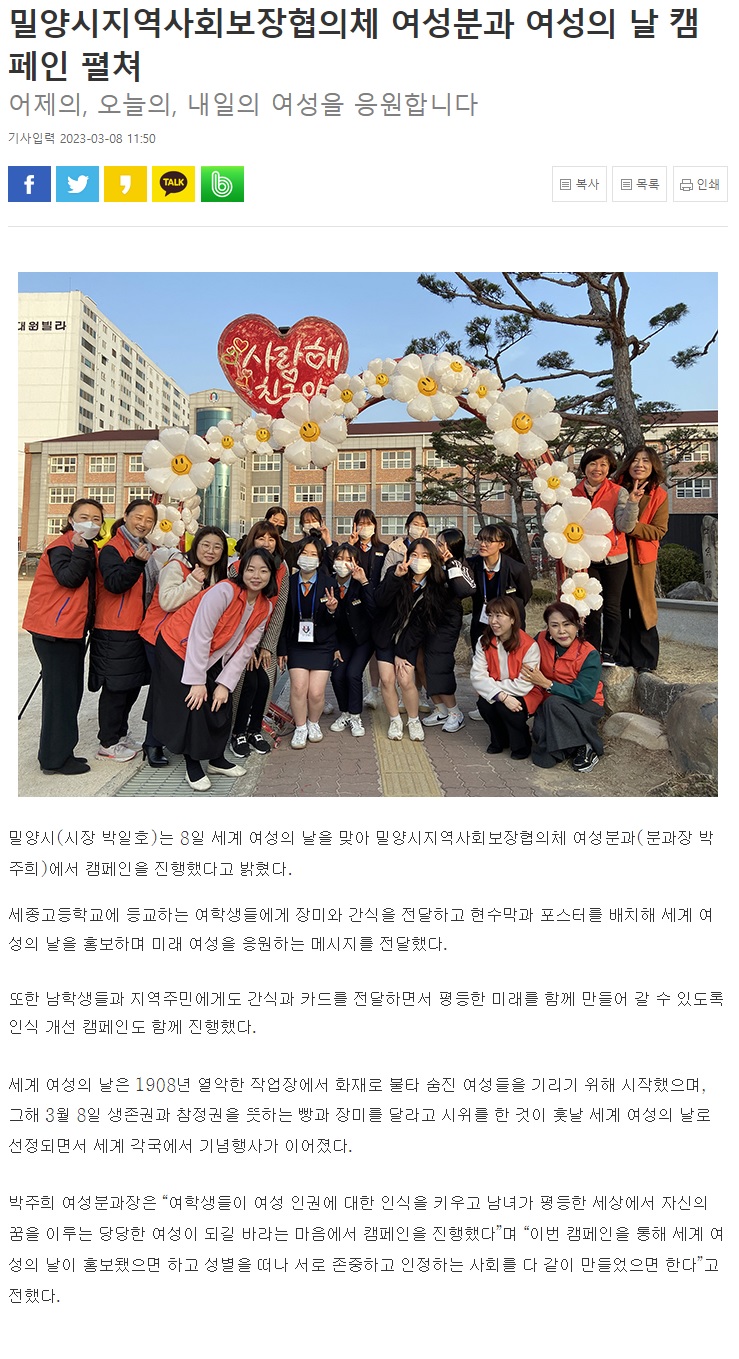 밀양시지역사회보장협의체 여성분과 여성의 날 캠페인 펼쳐