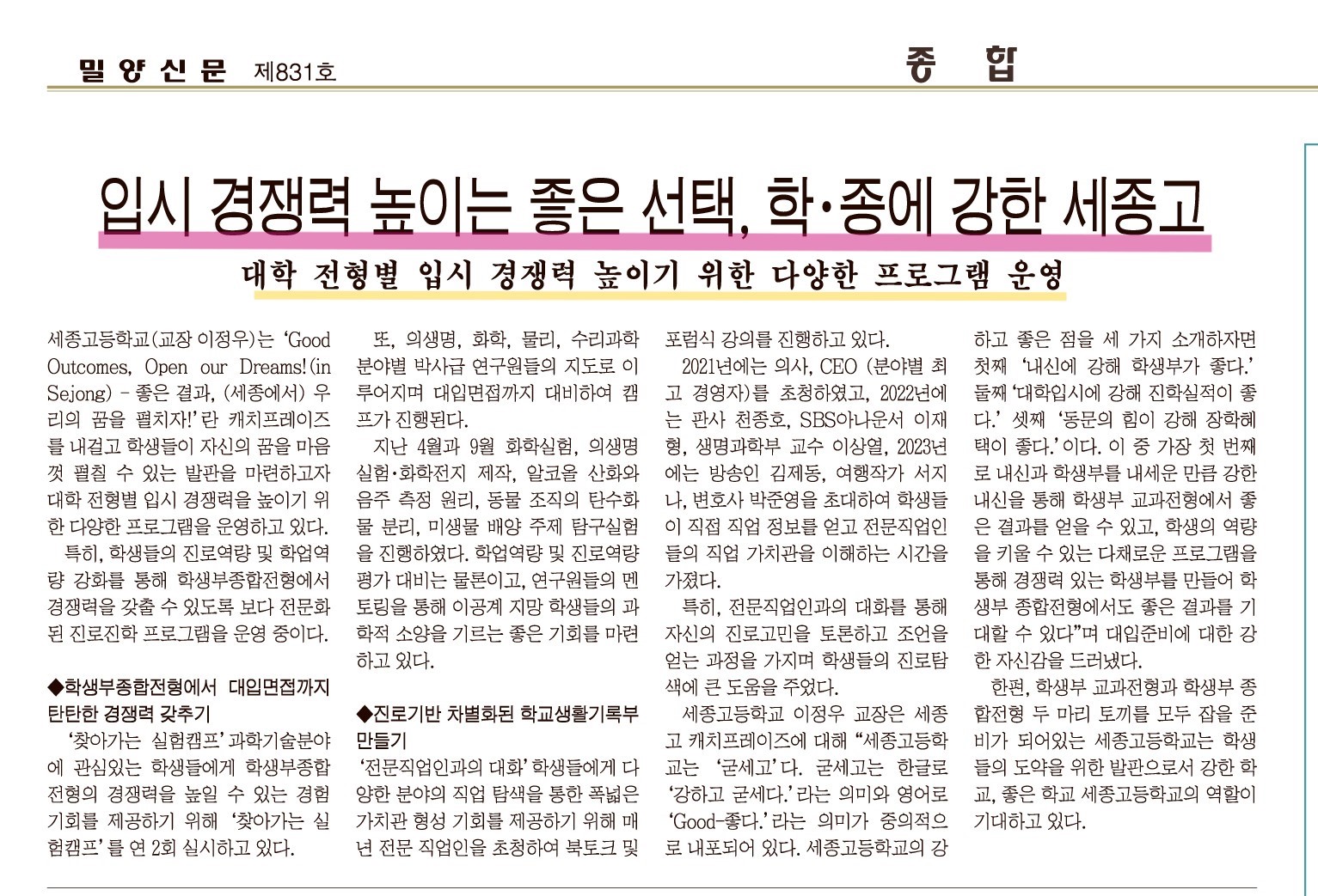 입시 경쟁력 높이는 좋은 선택, 학종에 강한 세종고