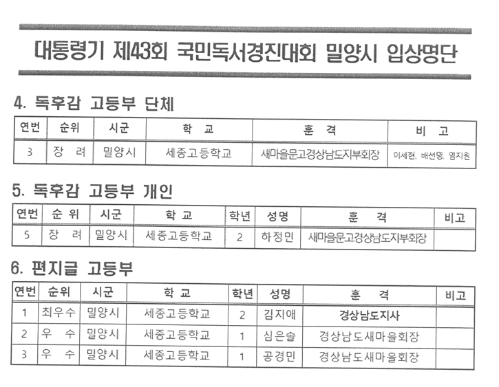 대통령기 제43회 국민독서경진대회 입상명단(세종고)