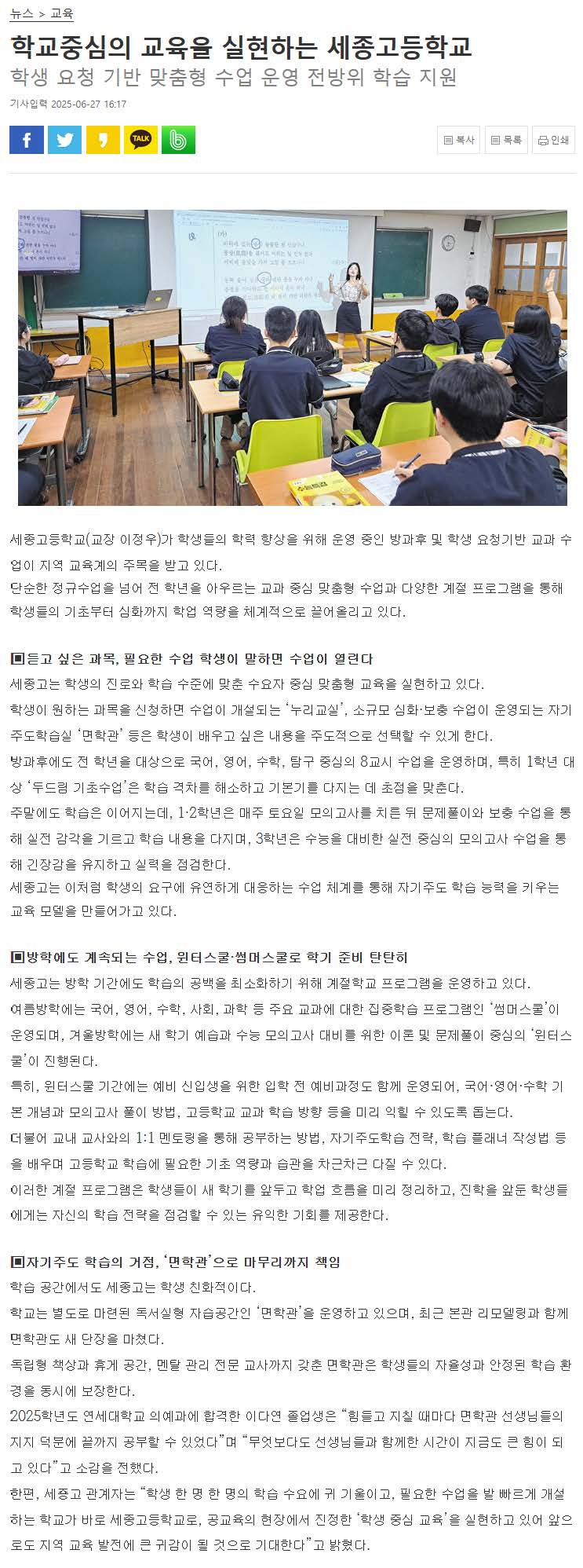 세종고, 학생 요청 기반 맞춤형 수업 운영 전방위 학습 지원