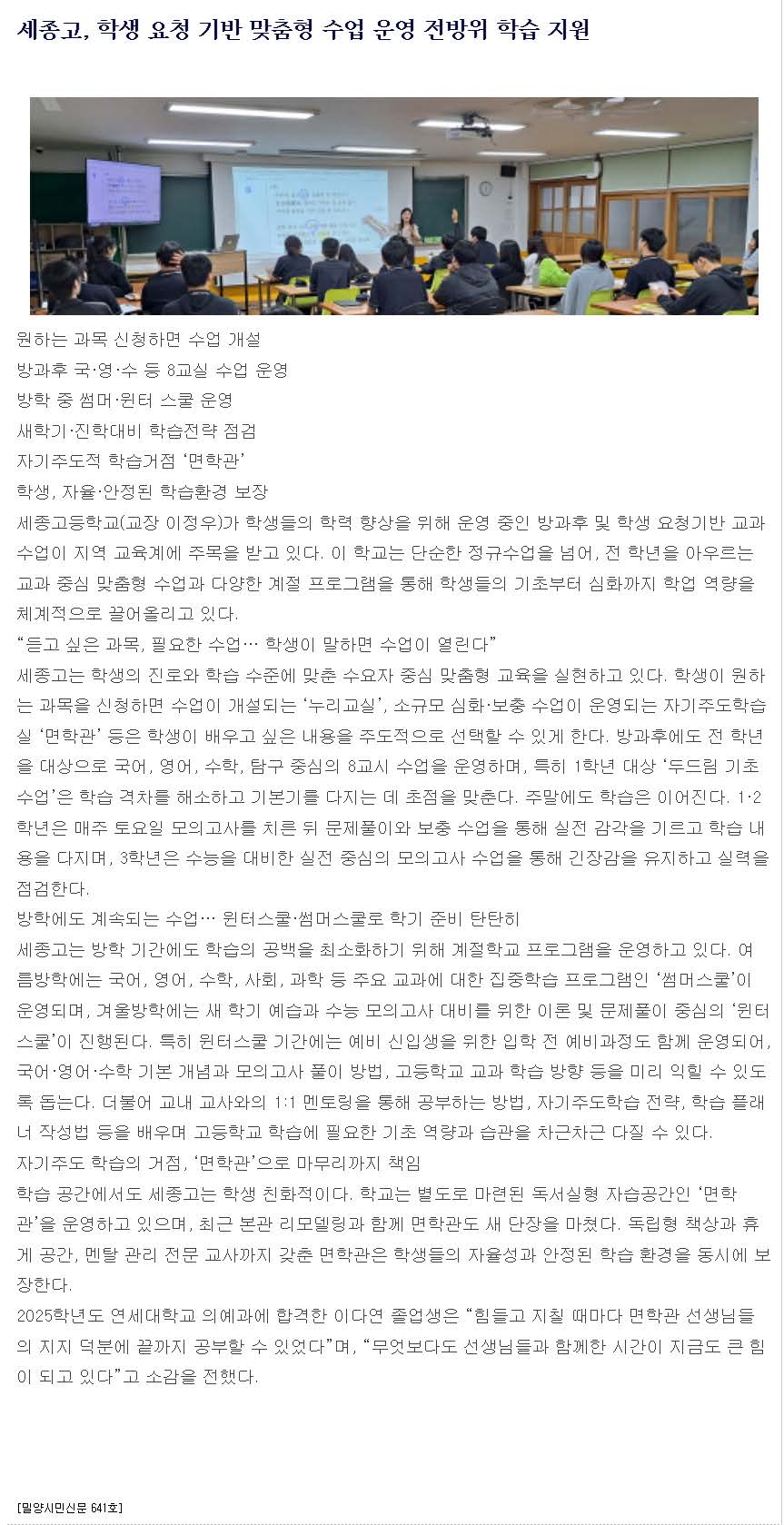 세종고, 학생 요청 기반 맞춤형 수업 운영 전방위 학습 지원